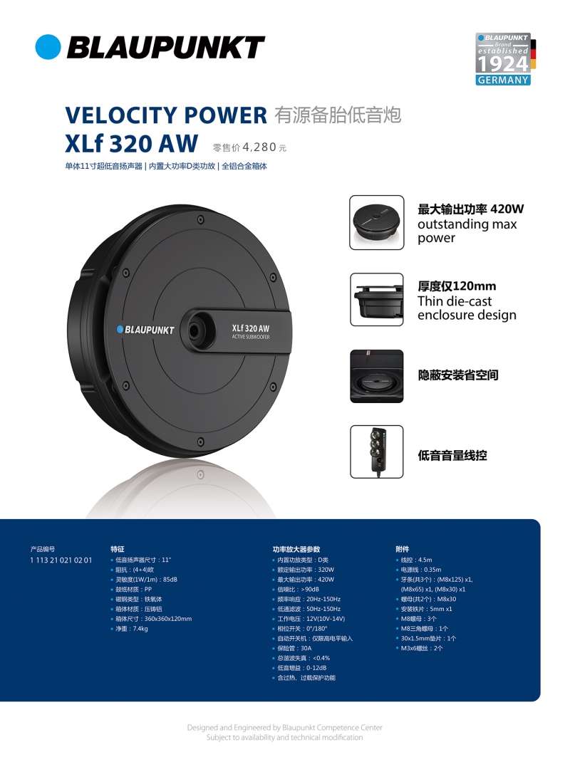 藍寶XLf 320 AW有源備胎炮擁有高達420W最大功率和大尺寸磁鐵為低頻提供過硬的傳輸基礎(chǔ),內(nèi)置D類放大器和一個11寸大低音喇叭提供超足的低頻能量,振幅面積更是超大發(fā)揮,讓低頻量感和聲壓有更好的表現(xiàn)。
