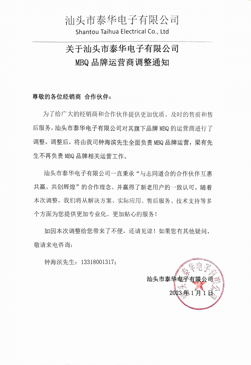 關(guān)于汕頭市泰華電子有限公司MBQ品牌運(yùn)營商調(diào)整通知
